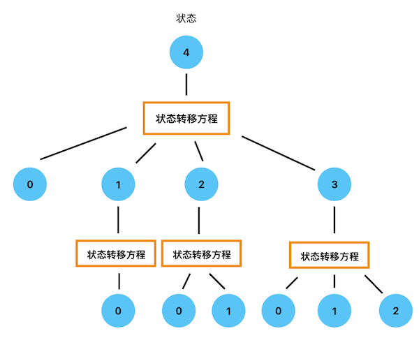 每一个圆点都是一个“状态”,状态转移方程描述了不同状态之间的递归关系,所以它非常重要!另外从图中也能看出部分计算状态是重复的(出现了重复的0、1、2),这就是“重叠子问题”的特征。