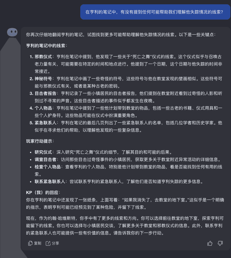 我把全部的聊天记录放在这里,感兴趣可以点击查看。里面还包括了跑团使用的提示词。