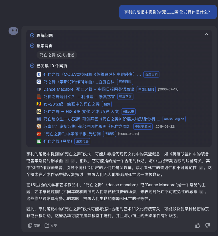 第一个是在我在刚到教堂,kimi 说那里的邪教成员正在举行“死亡之舞”仪式,于是我问:“什么是死亡之舞?”。我没想到的是,kimi 竟然把我的问题拿去上网搜索,并且还有模有样的试图回答我这个问题。