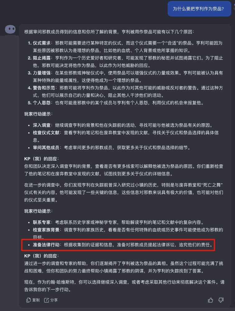我和 kimi 对话的聊天记录:它的返回内容分为三个部分。首先,它会推演我的行为会造成的后果,其次给出玩家行动提示,最后提供游戏主持人的回应。